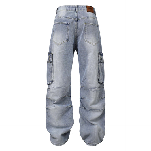 Salopette en denim multi-poches plissée en détresse délavée High Street American