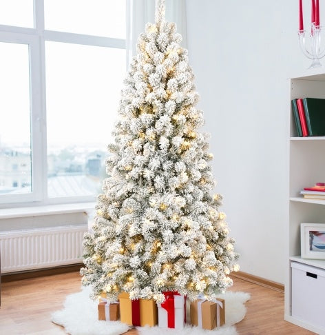 Sapin de Noël floqué pré-éclairé de 5 pieds avec 498 embouts de fil à mémoire de forme, gonflé sans effort, parfaitement formé et éclairé avec 200 lumières incandescentes chaudes apportant une élégance et un raffinement durables à vos vacances