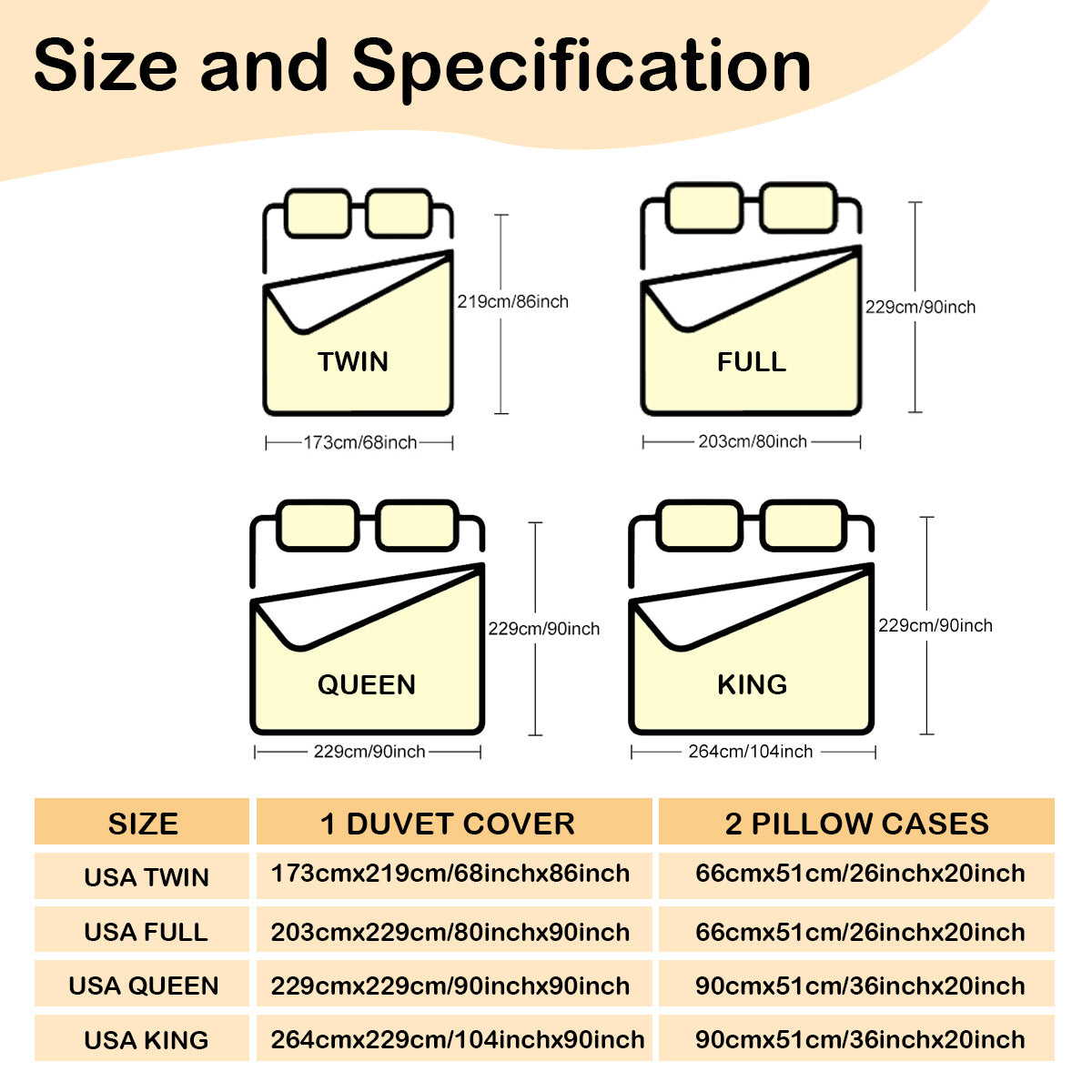 Queen size Duvet cover: 90" x 90" Pillow sham: 20" x 36"